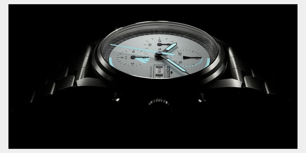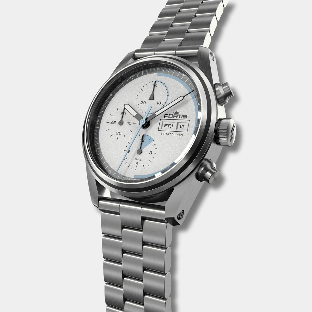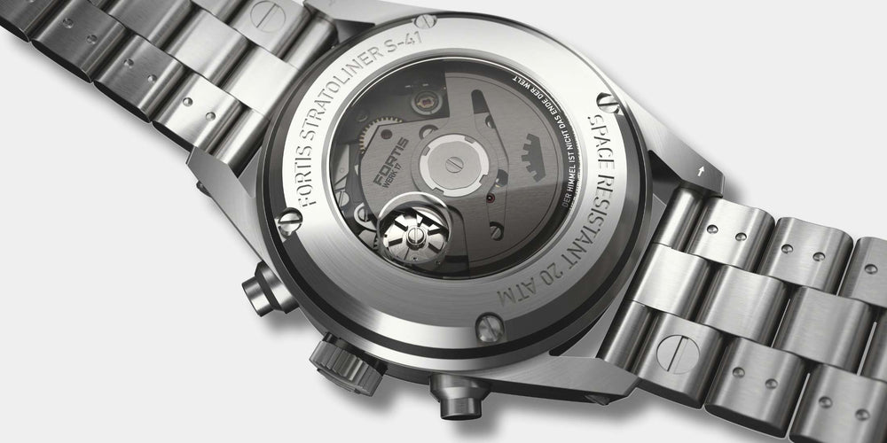 Das Fortis Werk 17 Automatic Manufaktur-Kaliber verfügt über einen Chronographen mit Schaltrad für erhöhte Zuverlässigkeit. Von den Fortis-Uhrmachern in Grenchen gemäß den Fortis-Leistungsanforderungen auf Chronometerstandards reguliert.