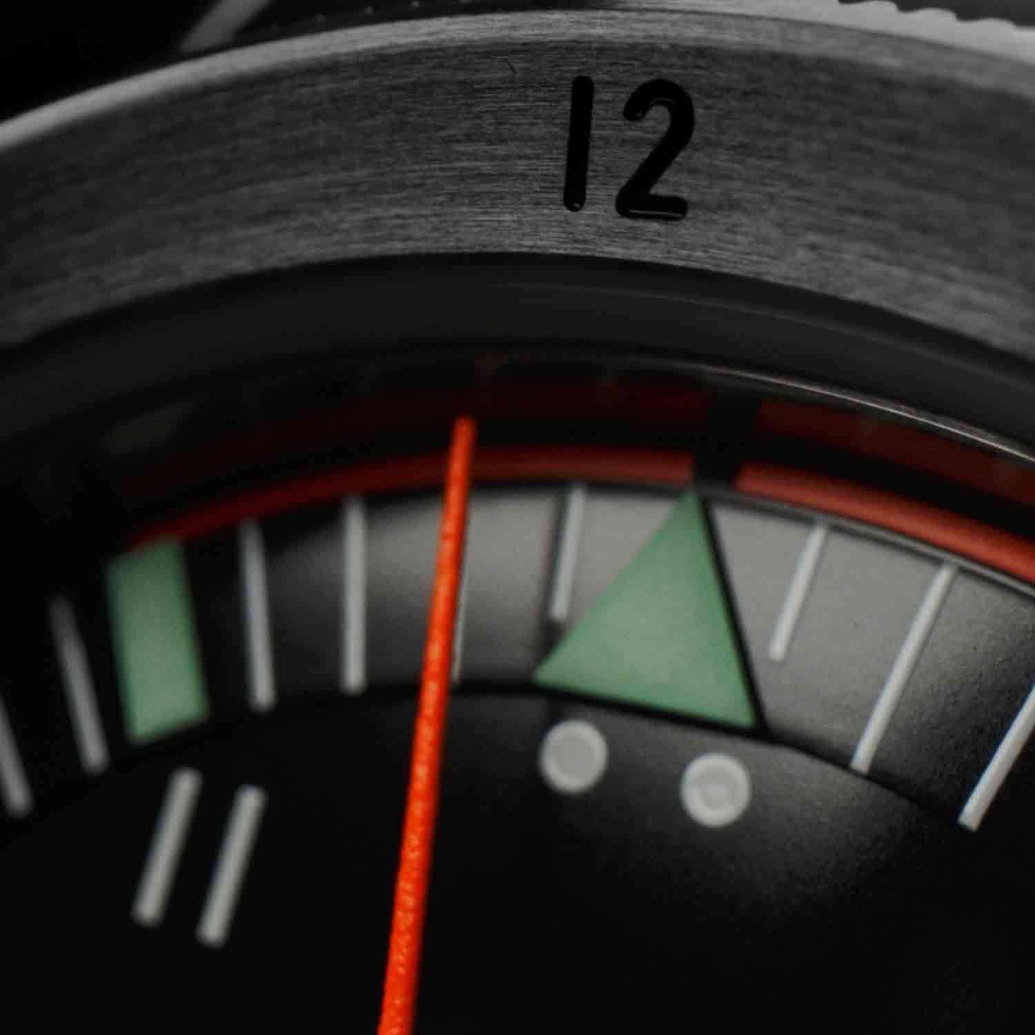 Mattschwarzes Zifferblatt mit appliziertem rund gebürstetem Brixtrack®. Brix aus pilotengrünem Superluminova®X1. Berlac Fluor Orangene Synchroline®