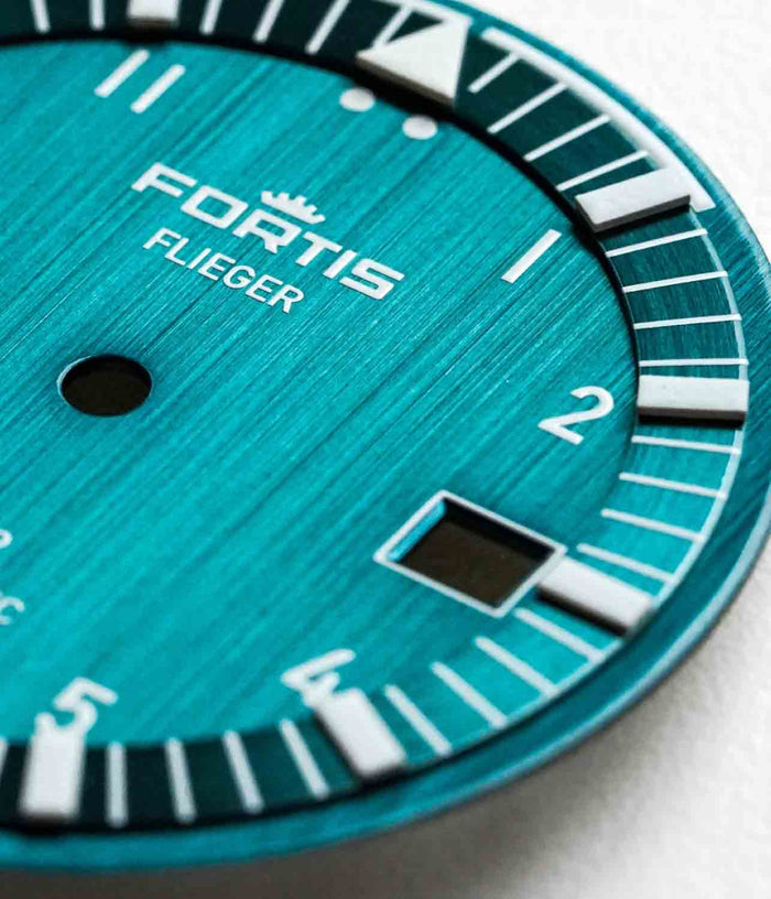 Das gebürstete Zifferblatt des Flieger F-39 Petrol ist nicht nur visuell beeindruckend, sondern auch für maximale Ablesbarkeit konzipiert. Durchtränkt mit Superluminova X1, ist es eine Tool Watch, die ins Auge fällt und keine Sekunde verpasst.