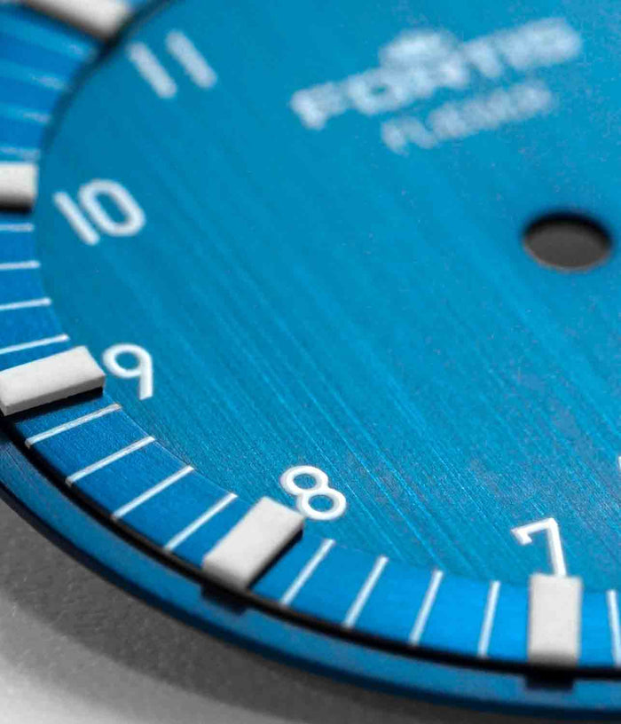 Vertikal gebürstetes blaues Zifferblatt mit appliziertem rund gebürstetem Brixtrack®. Weiße Brix und Synchroline® aus Superluminova®X1.