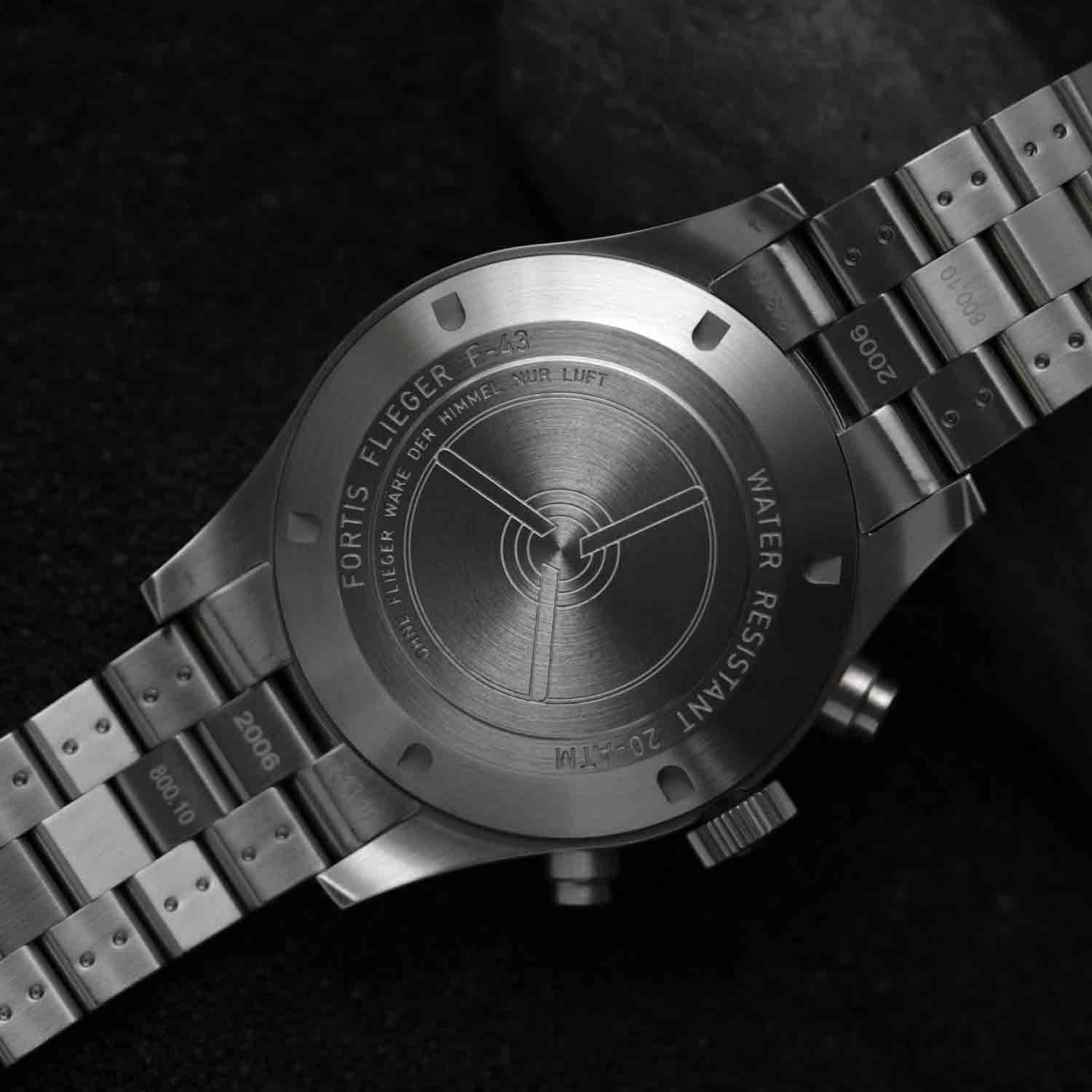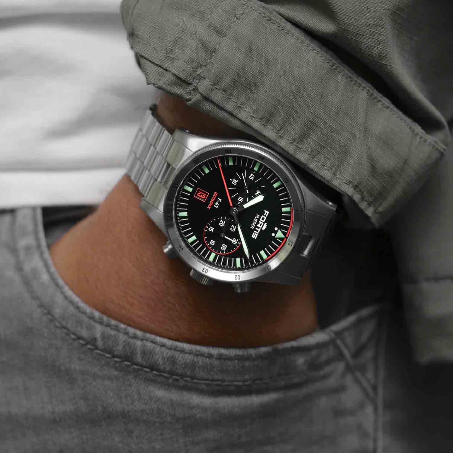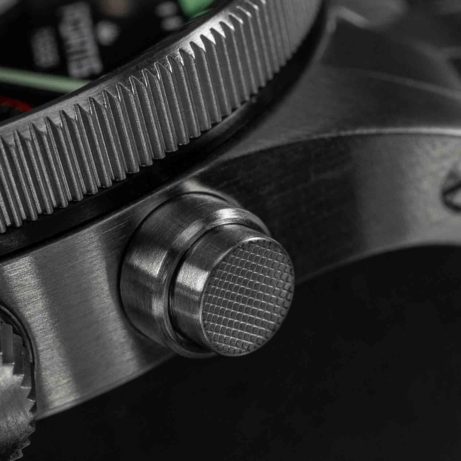 Aus der Nähe betrachtet offenbart das Zifferblatt der Flieger Bicompax Original seine präzise Detaillierung. Von den markanten Zeigern bis hin zu den Superluminova®-Indizes ist jedes Element für perfekte Sichtbarkeit unter allen Bedingungen ausgelegt.
