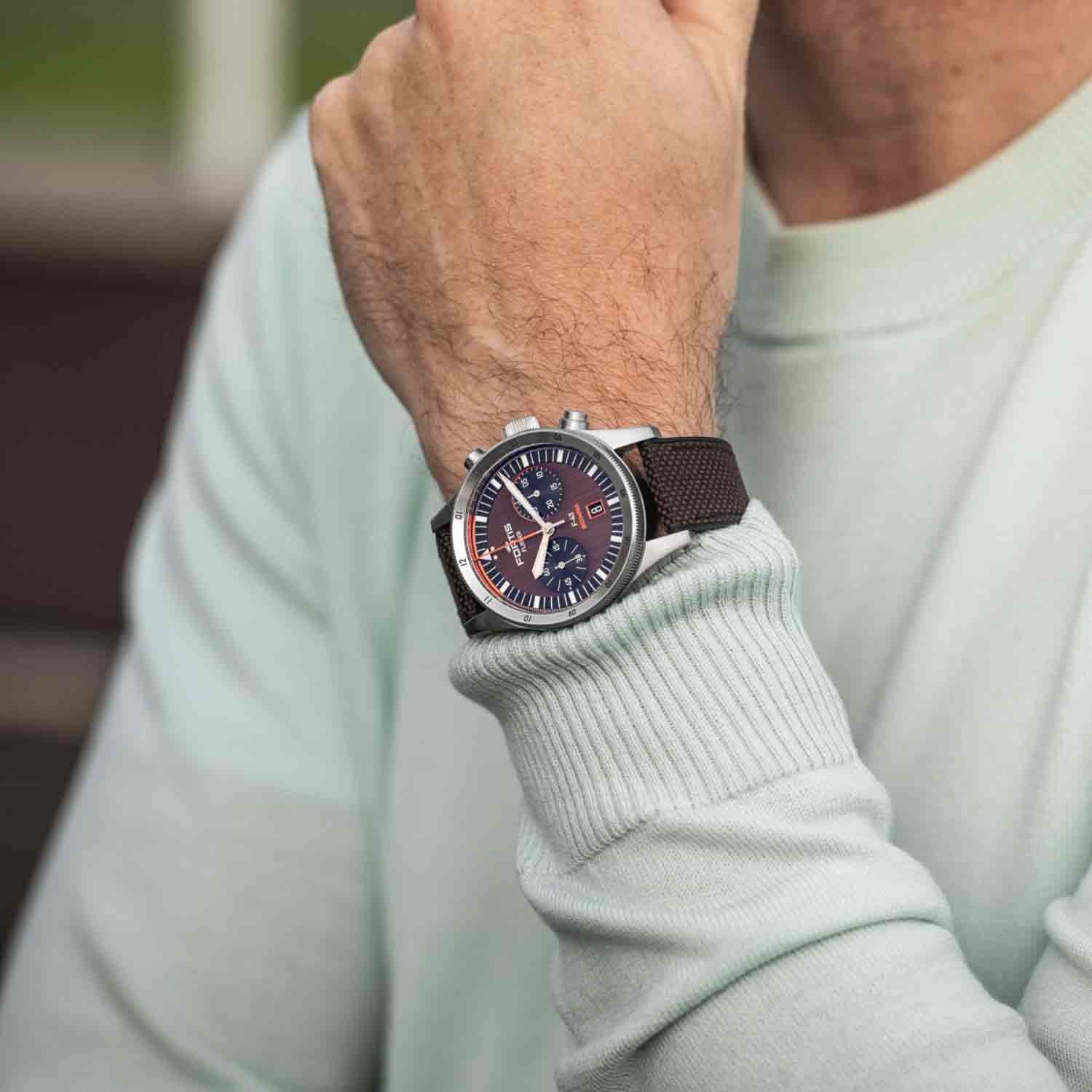 Die Fratello Edition Bicompax kombiniert ein Zifferblatt in sattem Umbra-Braun mit kühner Funktionalität. In Zusammenarbeit mit Fratello entworfen, wurde jedes Detail sorgfältig durchdacht, um Klarheit und Leistung zu gewährleisten.