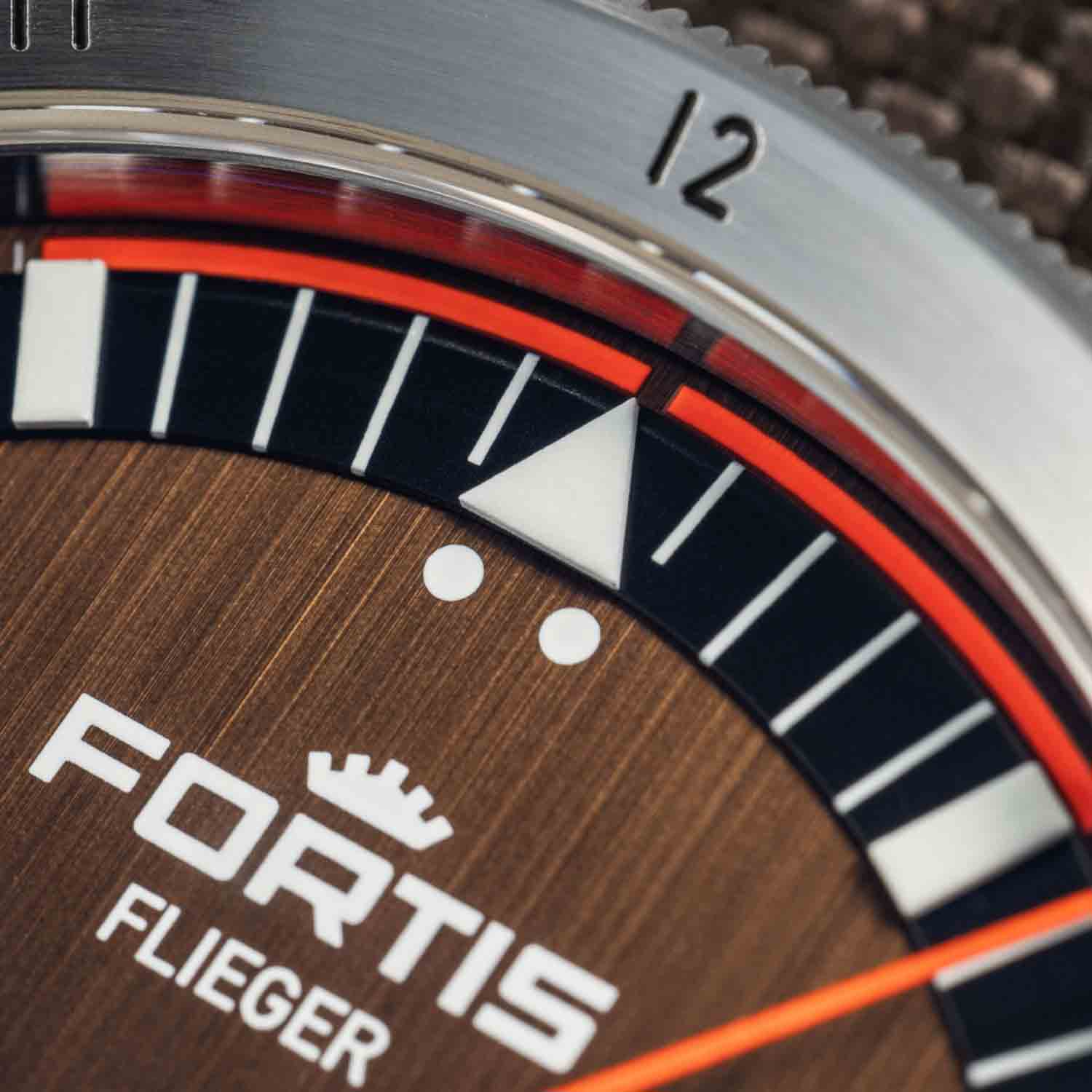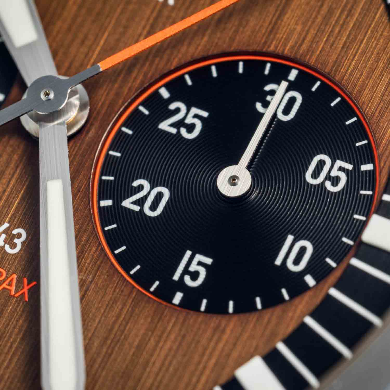 Vertikal gebürstetes braunes Zifferblatt mit aufgetragenem, kreisförmig gebürstetem Brixtrack®. Weiße Brix aus Superluminova®X1. Synchroline® in Berlac Fluor Orange.