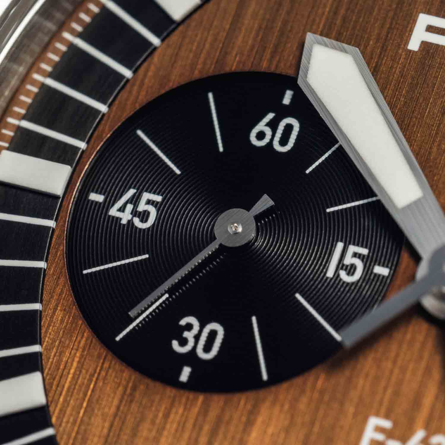 Aus der Nähe betrachtet offenbart das Umber Brown-Zifferblatt der Fratello Edition seine Tiefe und Präzision. Mit sorgfältig gefertigten Markierungen und einer glatten Oberfläche ist es ebenso raffiniert wie funktional.