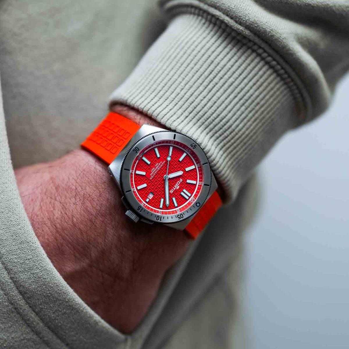 Oranges Zifferblatt mit dem Fortis O-Muster und applizierten Indizes aus Superluminova®X1.