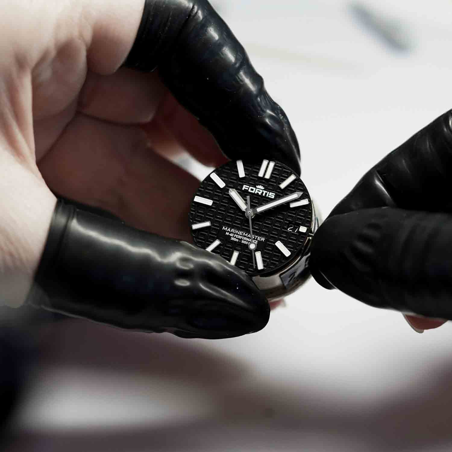 Schwarzes Zifferblatt mit Fortis O-Muster und aufgesetzten Indizes