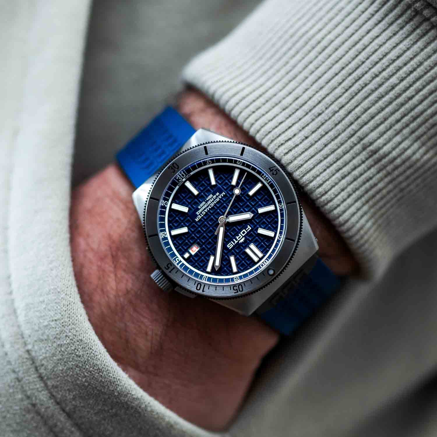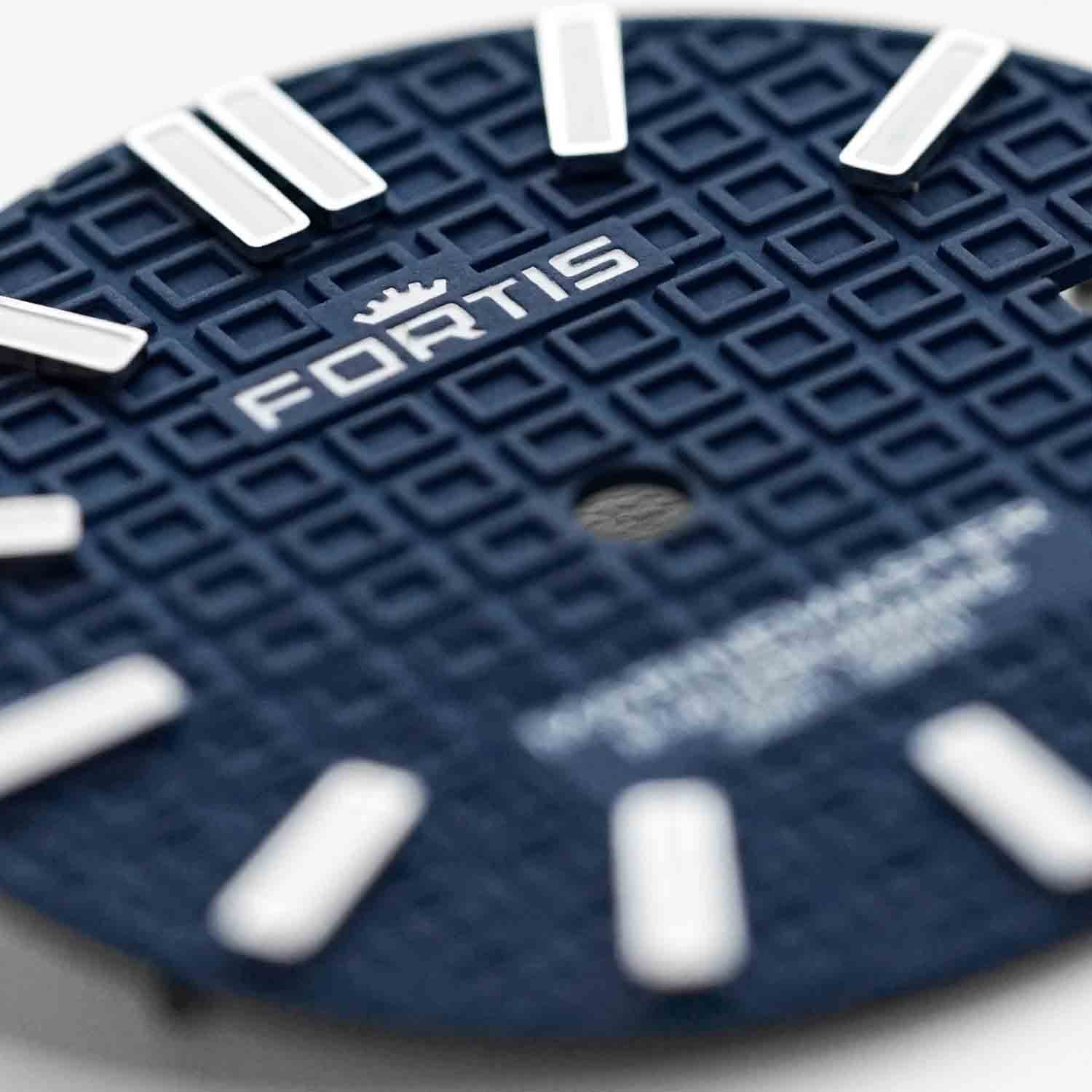 Blaues Zifferblatt mit dem Fortis O-Muster und applizierten Indizes aus Superluminova®X1.