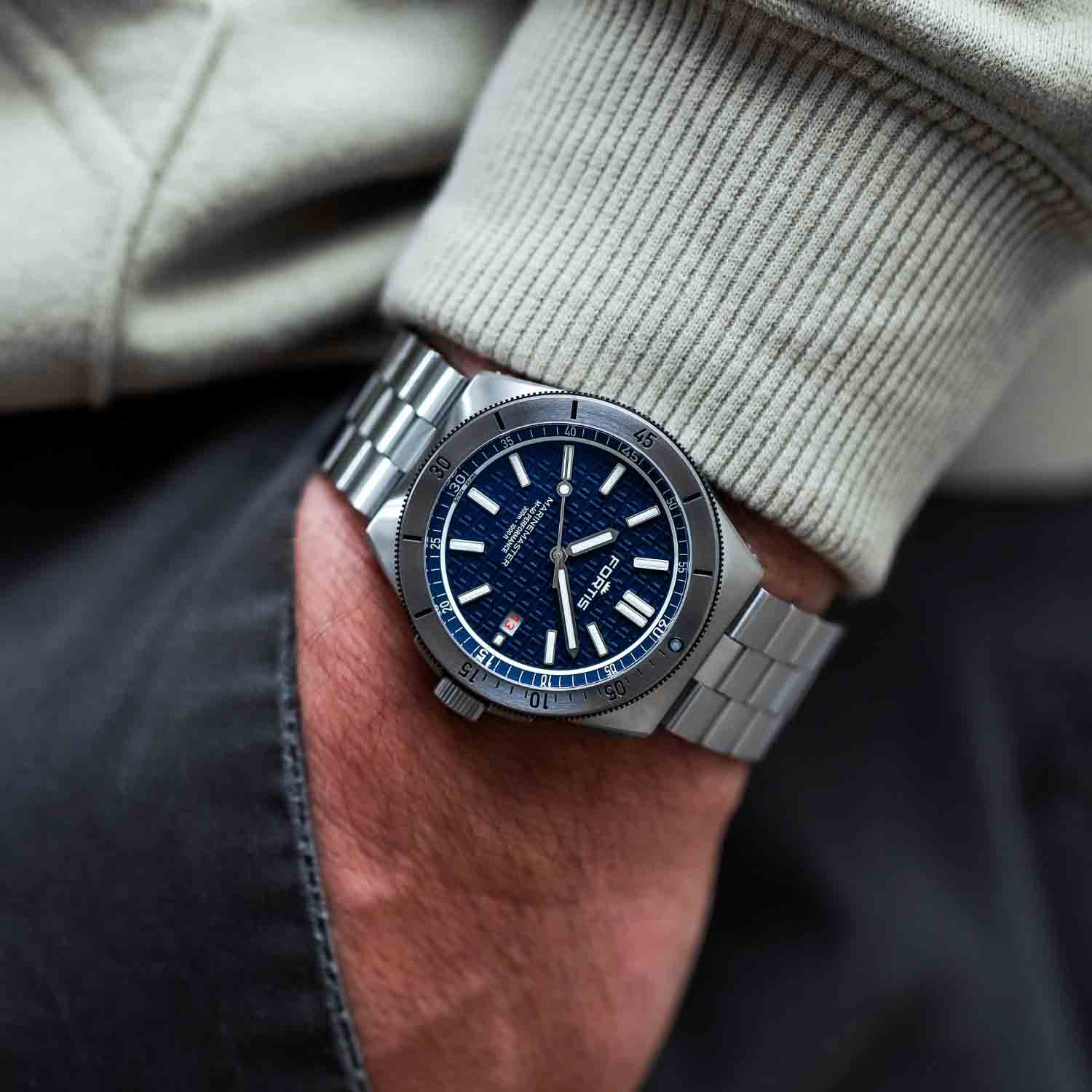 Blaues Zifferblatt mit dem Fortis O-Muster und applizierten Indizes aus Superluminova®X1.