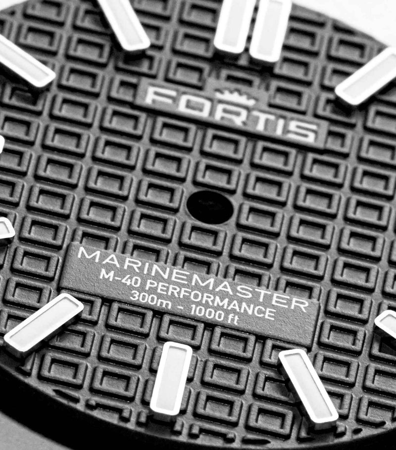 Graues Zifferblatt mit dem Fortis O-Muster und applizierten Indizes aus Superluminova®X1.