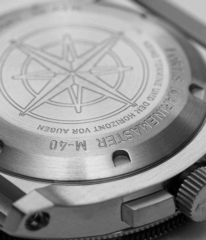 Mit einer Ultra-Gravur auf recyceltem Edelstahl lädt der Gehäuseboden des Marinemaster M-40 dazu ein, über die wesentlichen Dinge des Lebens nachzudenken. Er wurde für eine hohe Leistung entwickelt und ist sowohl ein robustes Werkzeug als auch eine zeitlose Erinnerung.