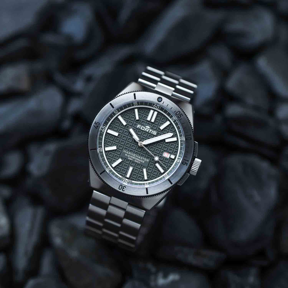 Der Marinemaster M-40 in Rockstone Gray ist für Mutige gemacht. Sein dezentes Design verbirgt das Kraftpaket im Inneren – 300 m wasserdicht und mit dem UW-30 Performance Movement ausgestattet, bereit für jedes Abenteuer.