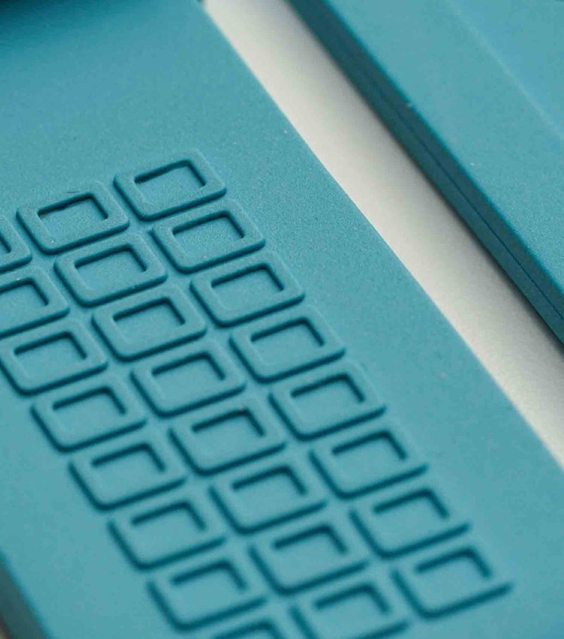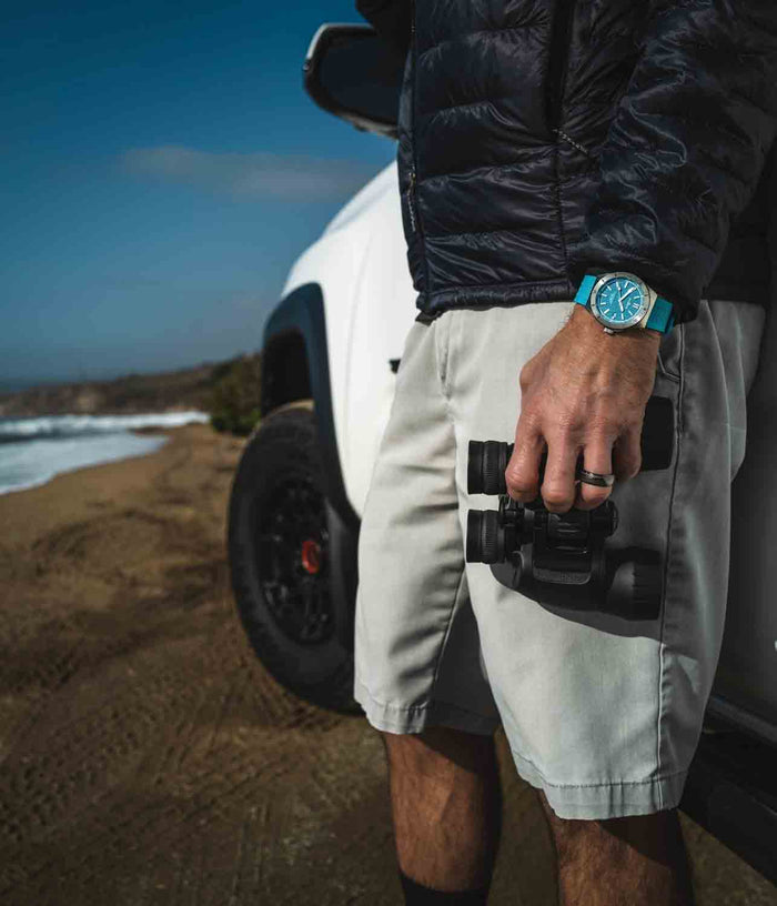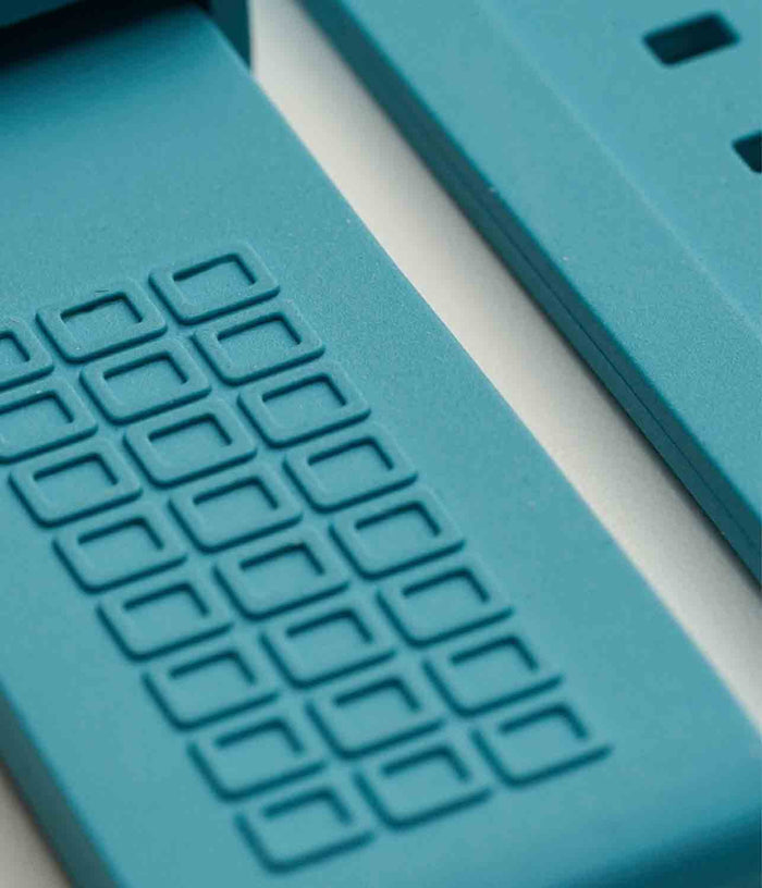 Hypoallergener FKM-Kautschuk. Beständig gegen Hitze, Chemikalien und UV-Strahlung, wodurch das Horizon-Armband ideal für alle Abenteuer, sowohl an Land als auch unter Wasser, geeignet ist.