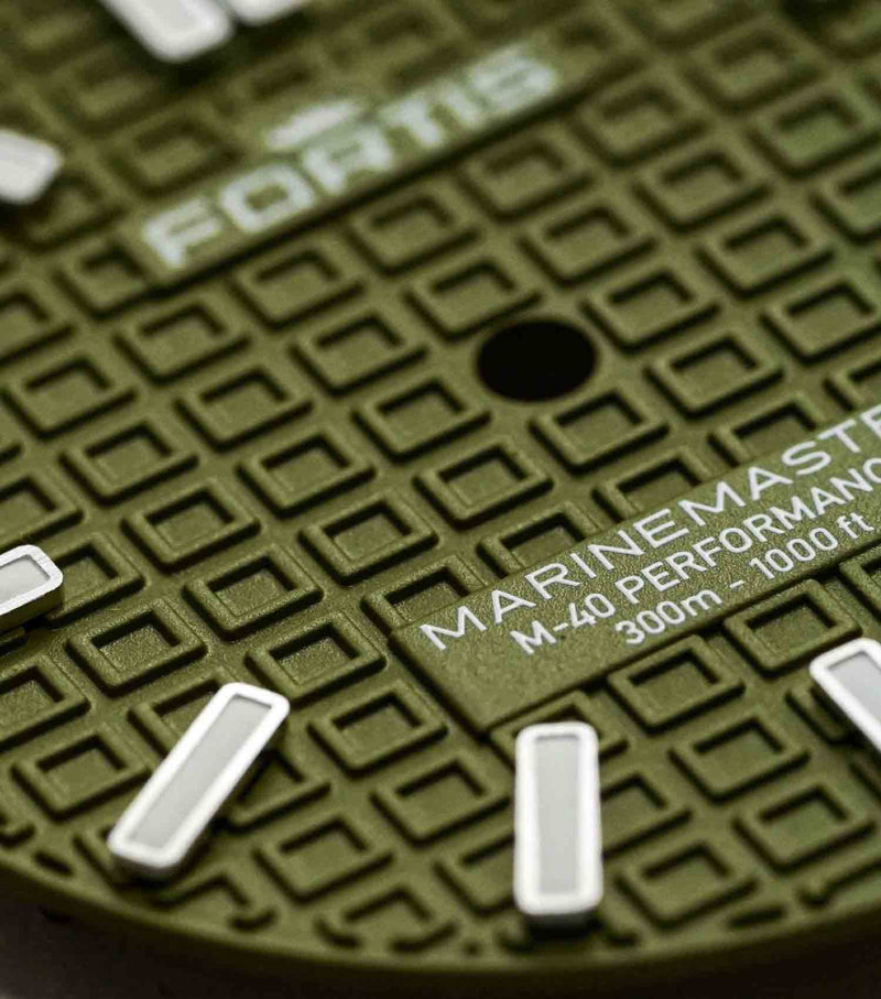 Grünes Zifferblatt mit dem Fortis O-Muster und applizierten Indizes aus Superluminova®X1.
