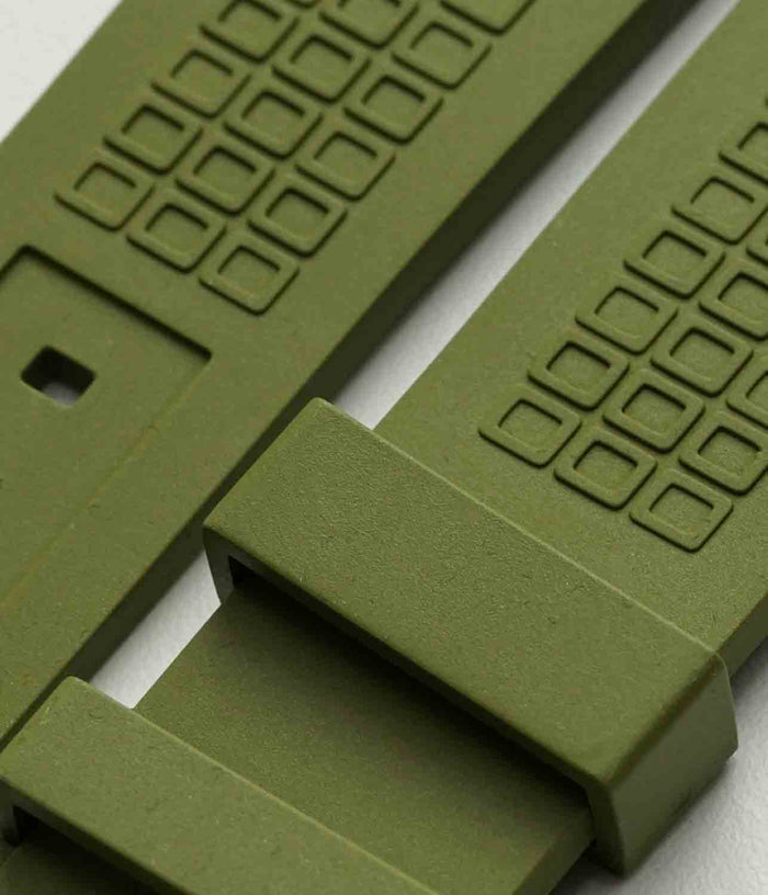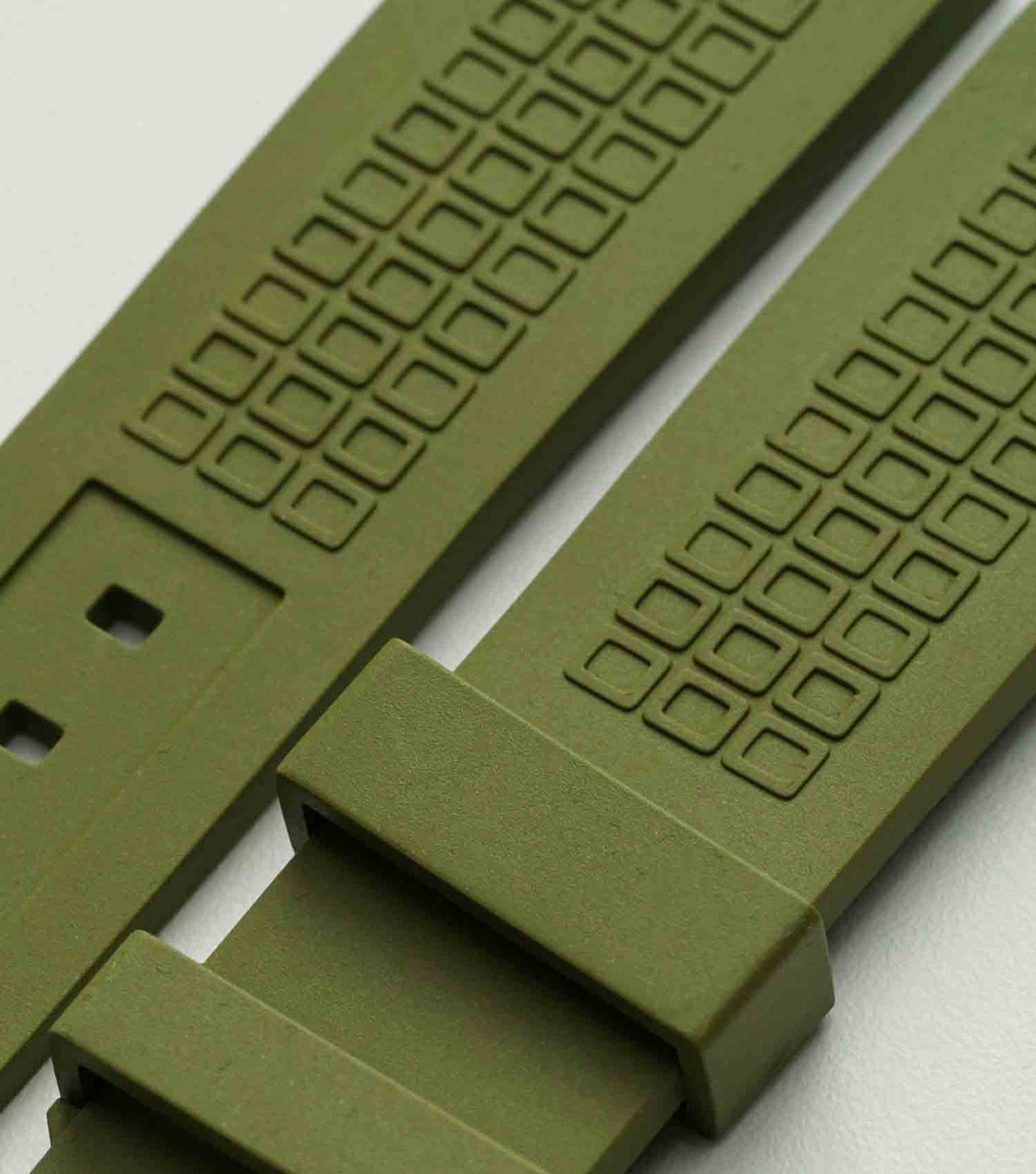 Hypoallergener FKM-Kautschuk. Beständig gegen Hitze, Chemikalien und UV-Strahlung, wodurch das Horizon-Armband ideal für alle Abenteuer, sowohl an Land als auch unter Wasser, geeignet ist.