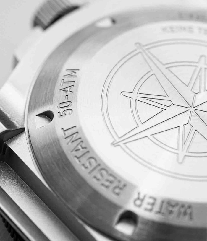 Der Gehäuseboden des Marinemaster M-44 aus recyceltem Edelstahl ist mit einer Gravur versehen, die daran erinnert, sich auf das Wesentliche zu konzentrieren. Mit einer Wasserdichtigkeit bis 500 m ist sie für diejenigen gemacht, die in die Abenteuer des Lebens eintauchen.