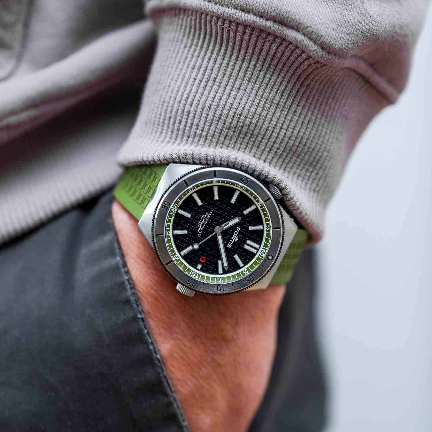 Das Horizon Strap vereint das Beste aus beiden Welten – flexibler, weicher Komfort mit der Stärke, auch den härtesten Bedingungen standzuhalten. Die „O“s aus dem Fortis-Logo verleihen der Gleichung einen Hauch von Tradition.