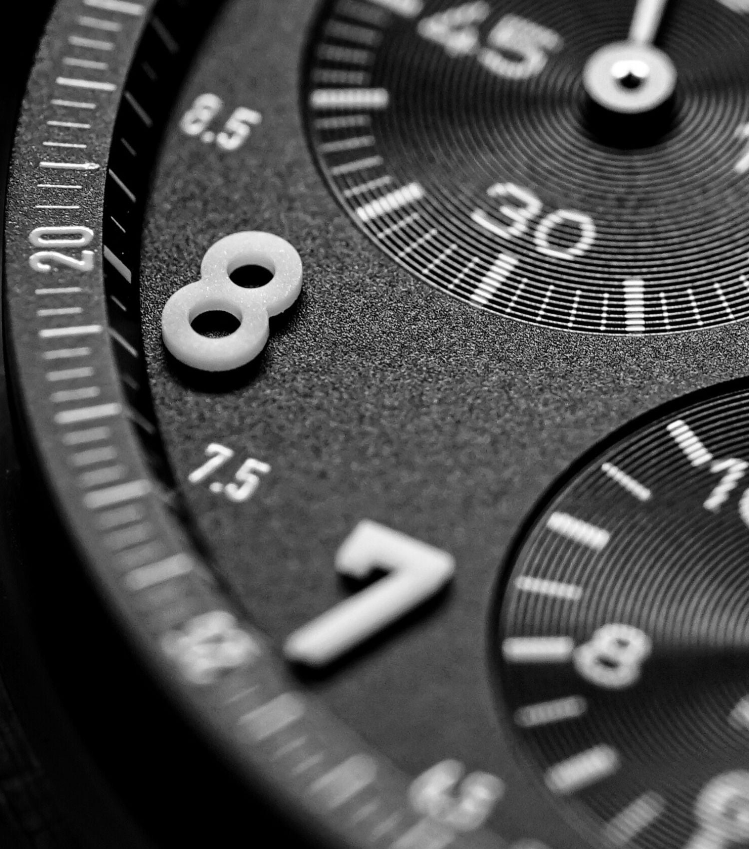 Matt schwarzes Zifferblatt mit aufgetragenen Lumicast®X1-Ziffern.