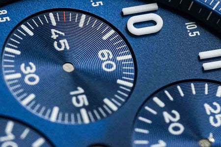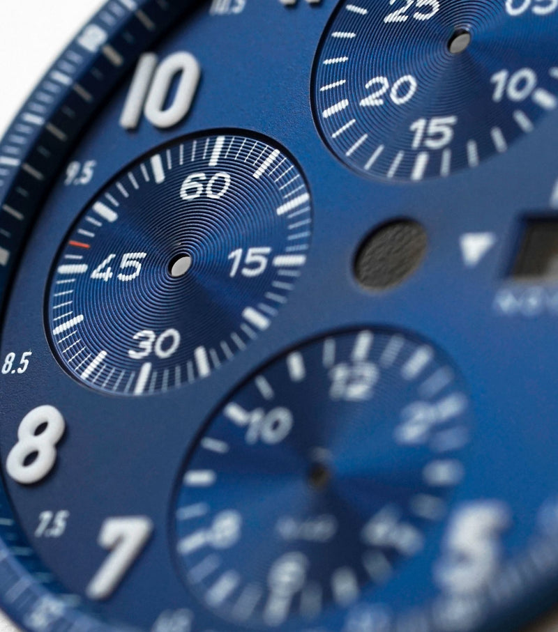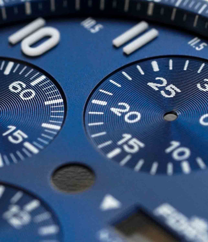 Sonnenschliff Blaues Zifferblatt mit aufgetragenen Lumicast®X1-Ziffern.