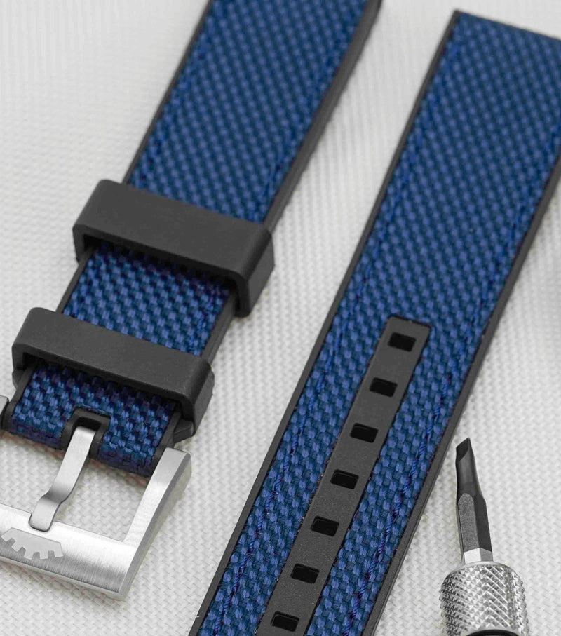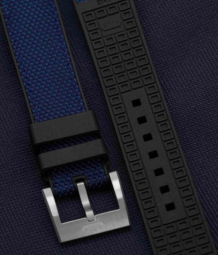 Das Fortis Hybrid-Armband kombiniert FKM-Kautschuk mit dem charakteristischen „O“ und strapazierfähigem Cordura für ein robustes, zugleich flexibles Tragegefühl. Wähle eine Dornschließe für den täglichen Komfort oder eine Faltschließe für einen Hauch von Luxus.