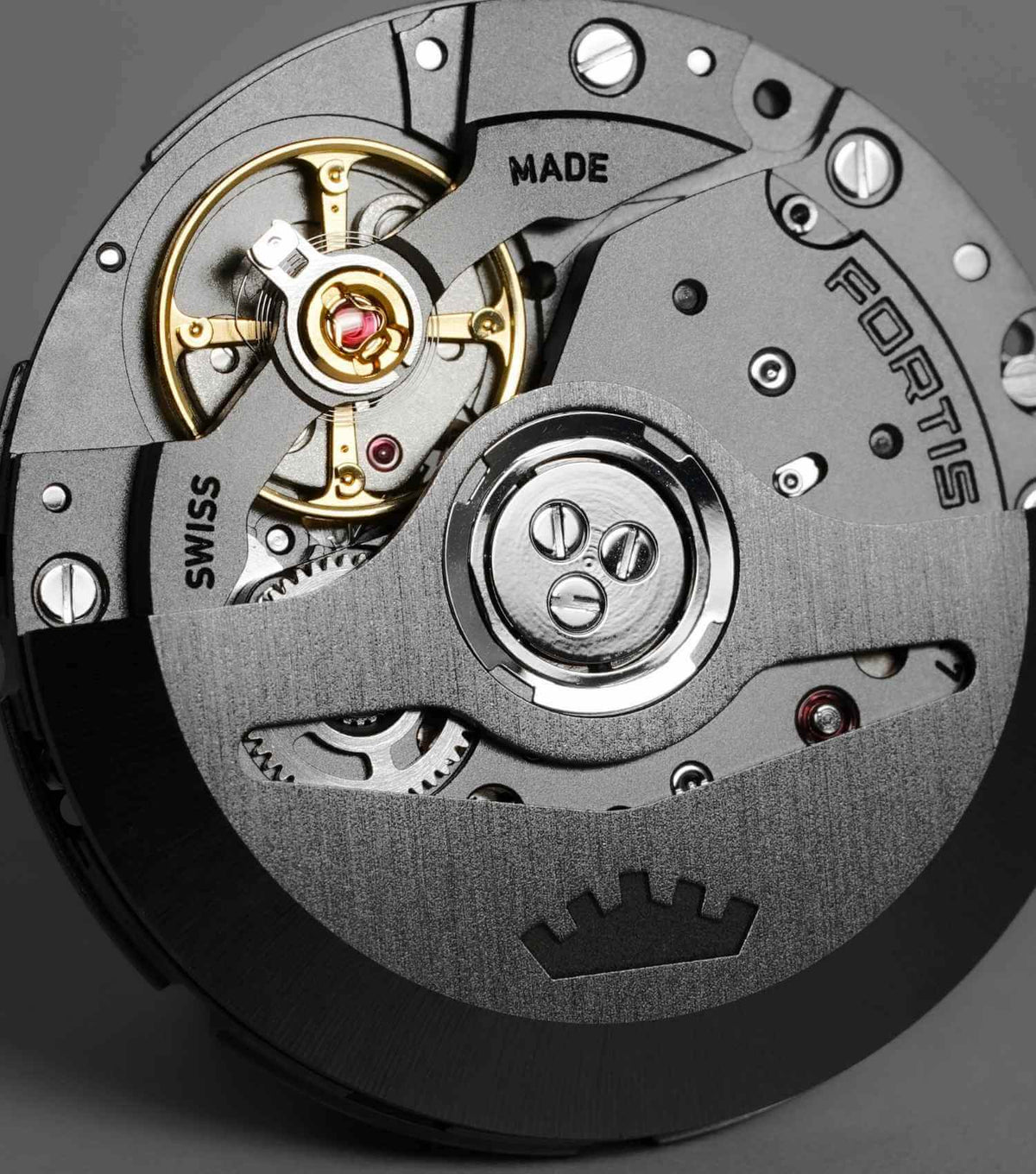 Werk 7 läutet eine neue Ära bei Fortis ein. Mit einer Gangreserve von 70 Stunden bietet dieses Kraftpaket unerschütterliche Zuverlässigkeit unter allen Bedingungen. Bei der Trägheitsregulierung wird die Ganggeschwindigkeit der Uhr durch Bewegen kleiner Gewichte auf der Unruh eingestellt, anstatt die Länge der Spiralfeder zu verändern. Dadurch bleibt das wahre Schwingungszentrum erhalten, was zu einer gleichmäßigeren Zeitmessung und einer geringeren Anfälligkeit für äußere Einflüsse führt. Die doppelte Fixierung der Unruh und eine übergroße Brücke bilden die Grundlage für die beispiellose Robustheit von Werk 7.