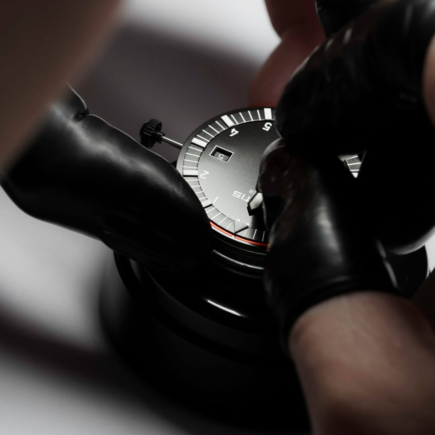 Matte Black dial with applied Brixtrack®X1 and Synchroline® in Berlac Fluor Orange
