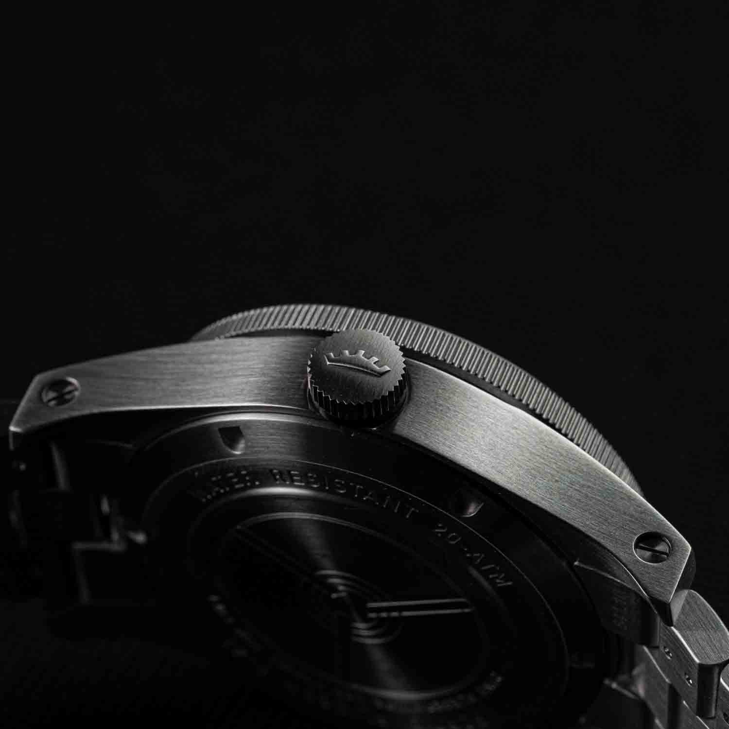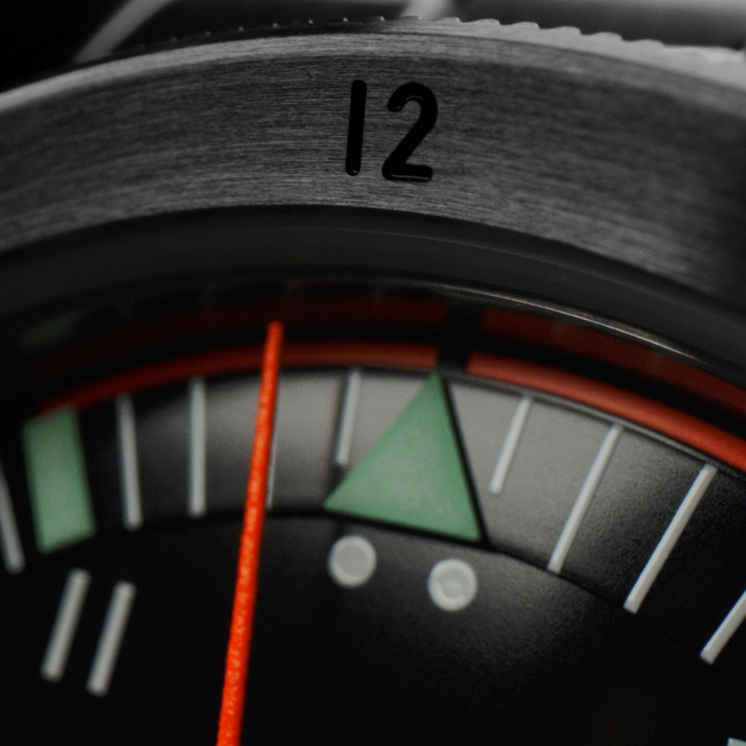 Matte black Dial with applied circular brushed Brixtrack®. Brix made of Pilot Green Superluminova®X1. Berlac Fluor Orange Synchroline®