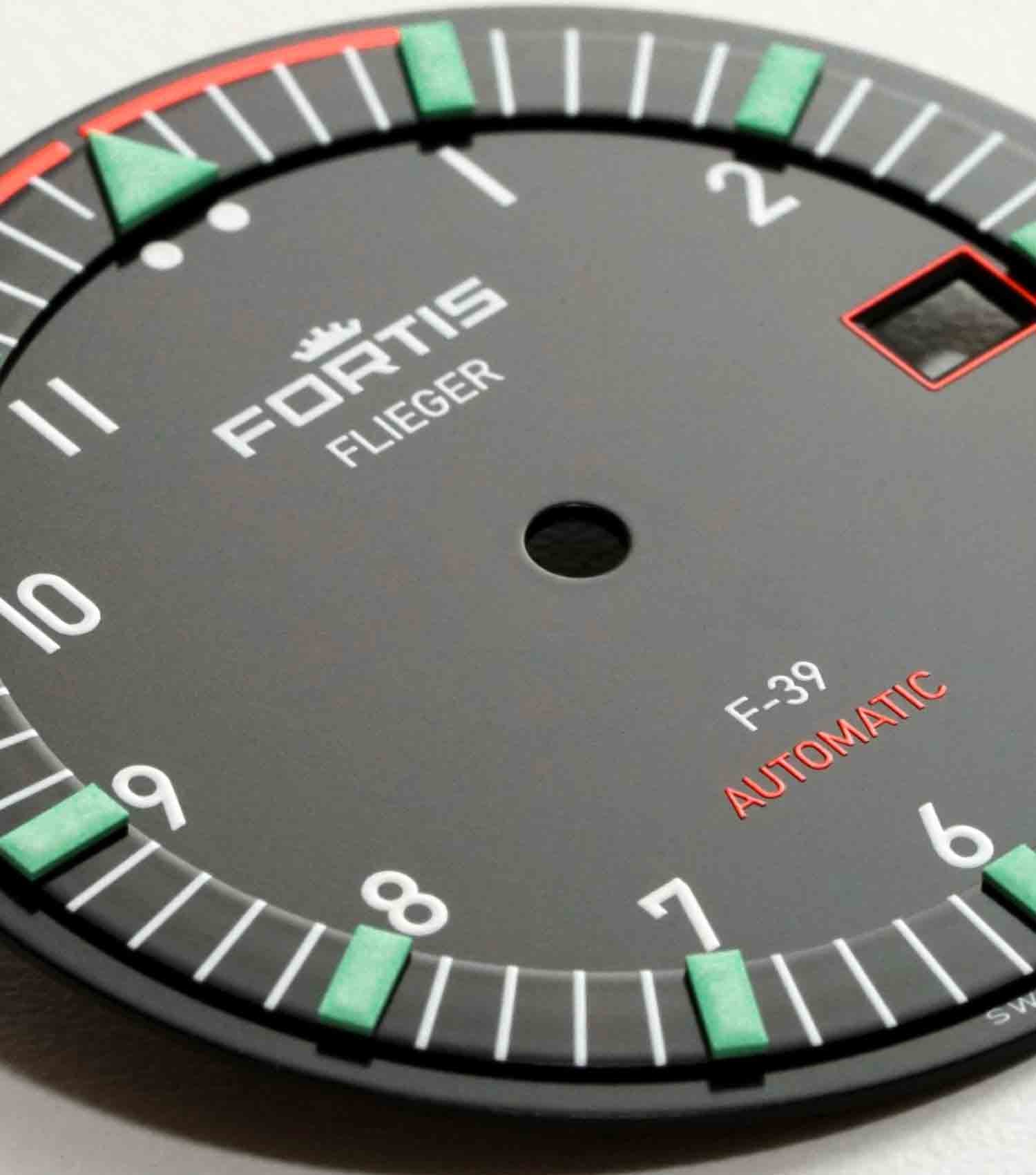 Matte black Dial with applied circular brushed Brixtrack®. Brix made of Pilot Green Superluminova®X1. Berlac Fluor Orange Synchroline®