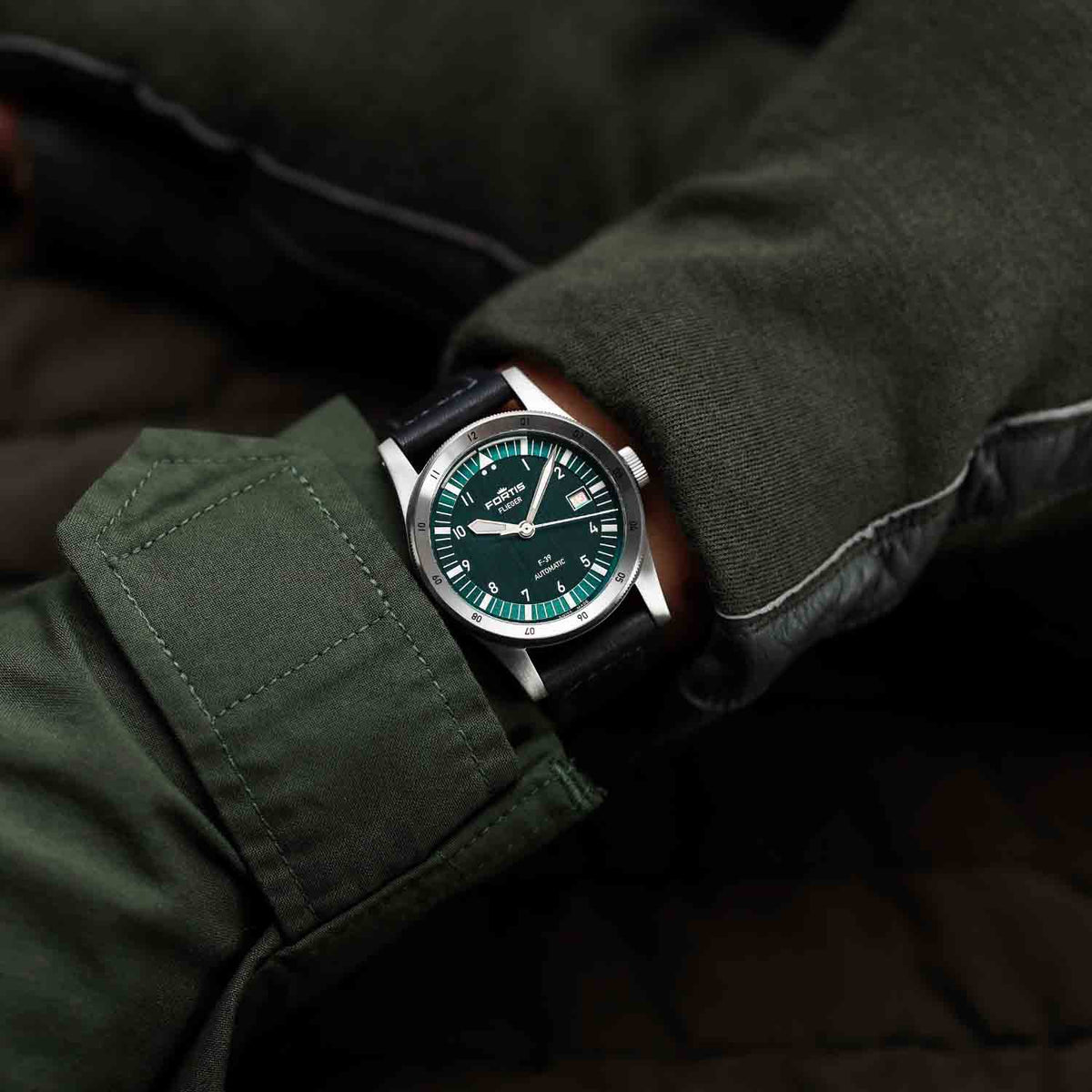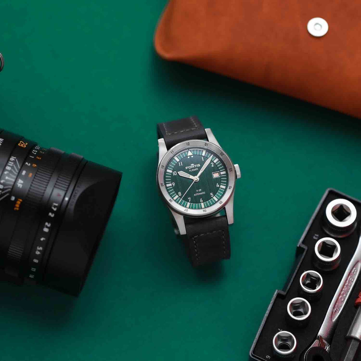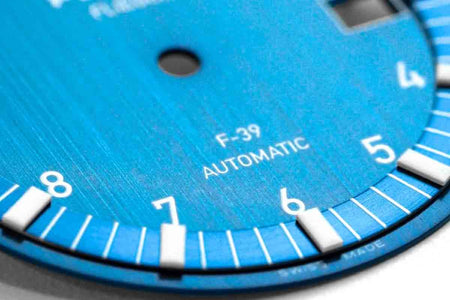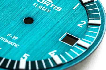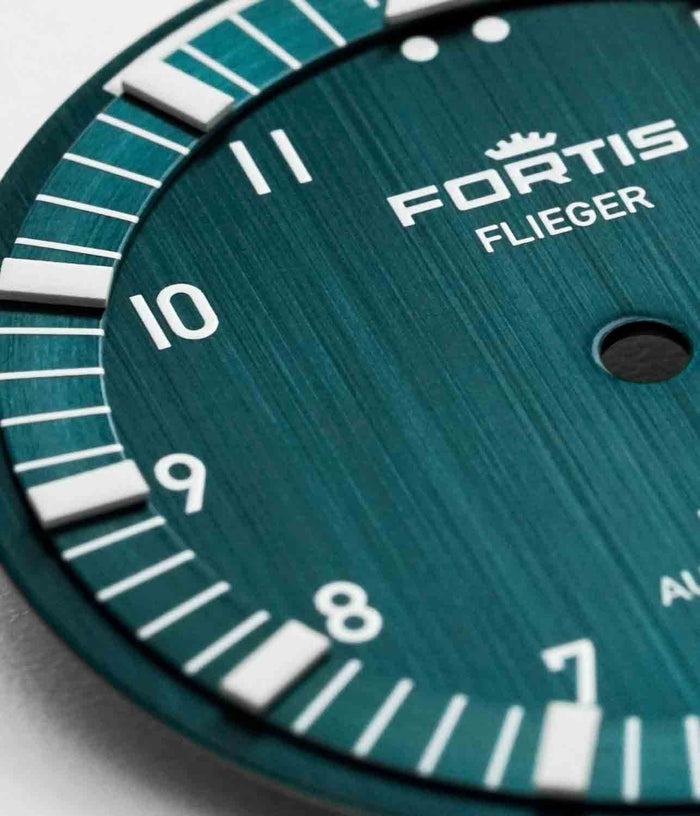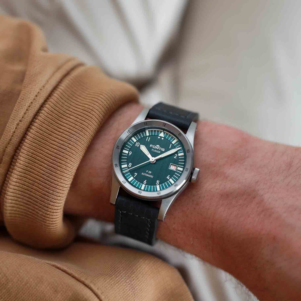 The Flieger F-39 Petrol’s brushed dial feels alive, its unconventional design bursting with Superluminova X1. Readability is instant, making it perfect for those who demand clarity at a glance.
