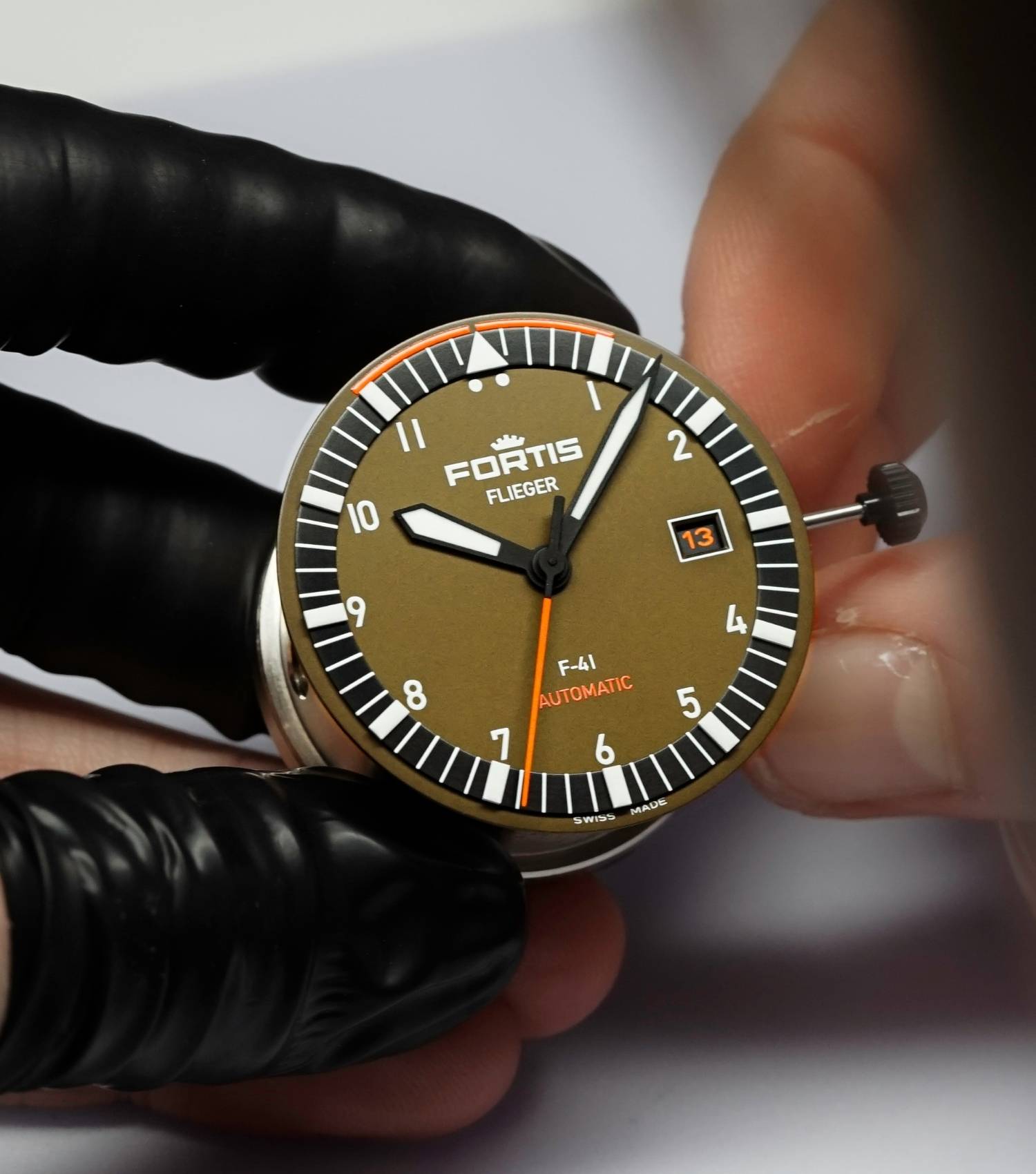 Matte Green dial with applied Brixtrack®X1 and Synchroline® in Berlac Fluor Orange