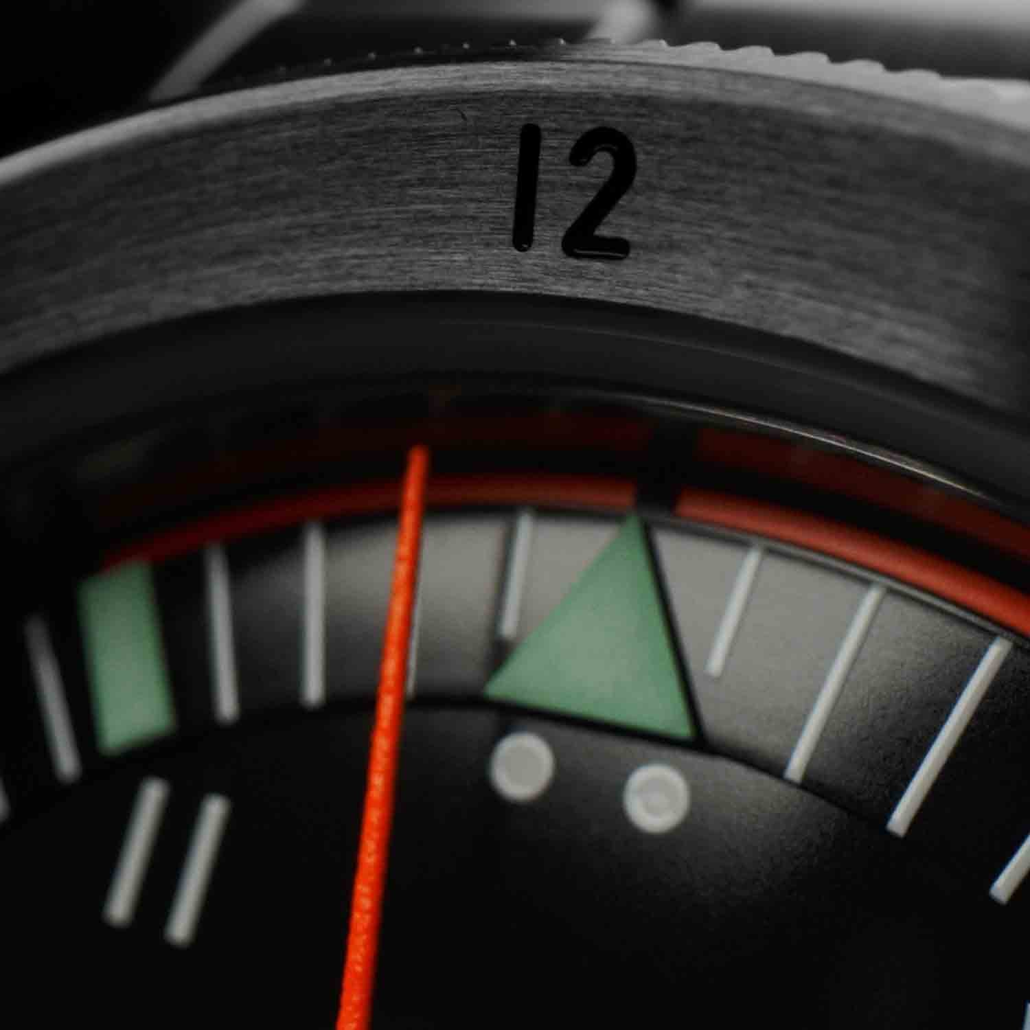 Matte black Dial with applied circular brushed Brixtrack®. Brix made of Pilot Green Superluminova®X1. Berlac Fluor Orange Synchroline®