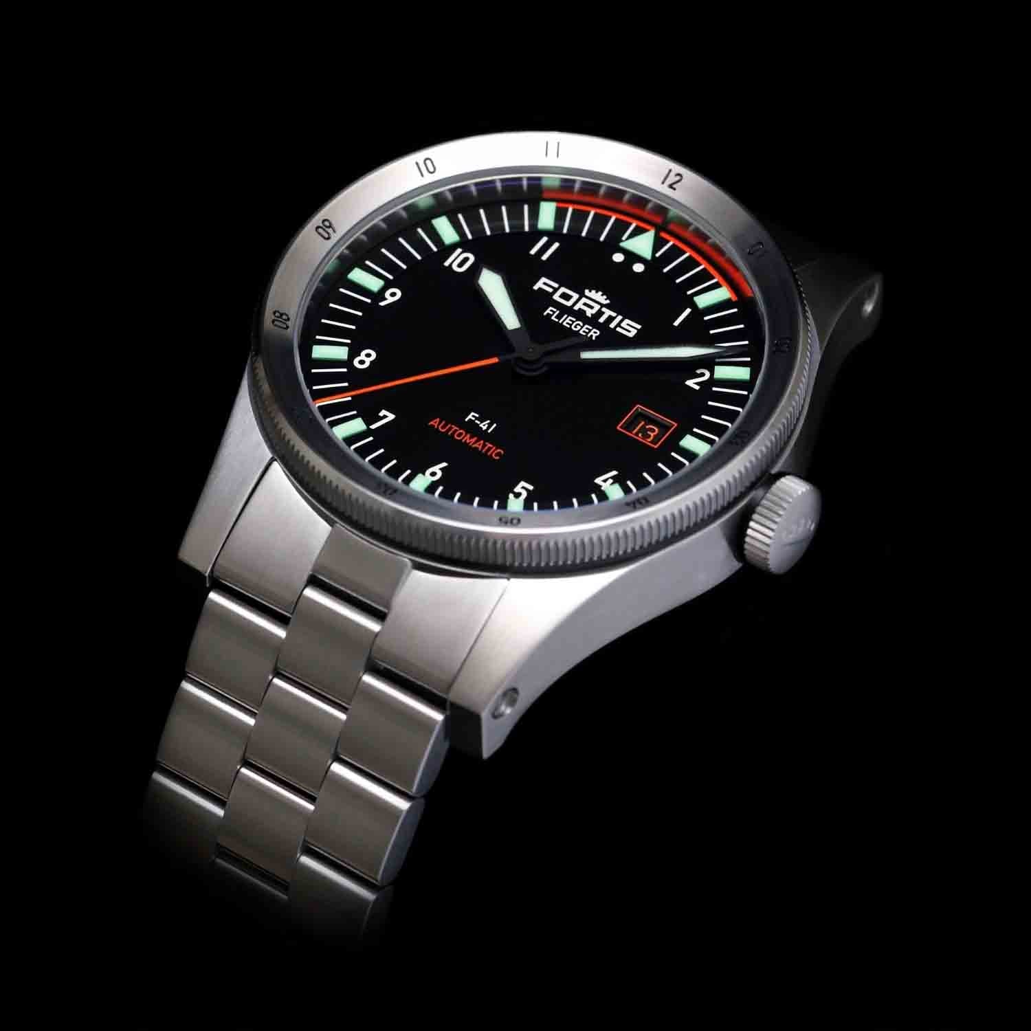 The Flieger F-41 Original’s green-orange highlights bring the dial to life, offering a striking contrast that enhances readability. Built for precision, designed for those who stand out.