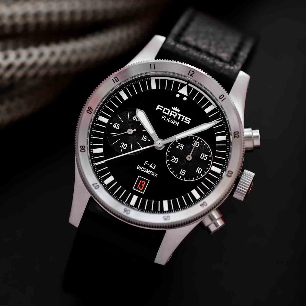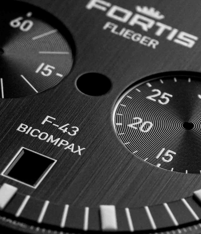 The Flieger F-43 Bicompax Black’s dial is a masterpiece of precision and clarity. From the bold Superluminova X1 markers to its sleek, streamlined design, every detail is engineered to perform flawlessly in any condition.
