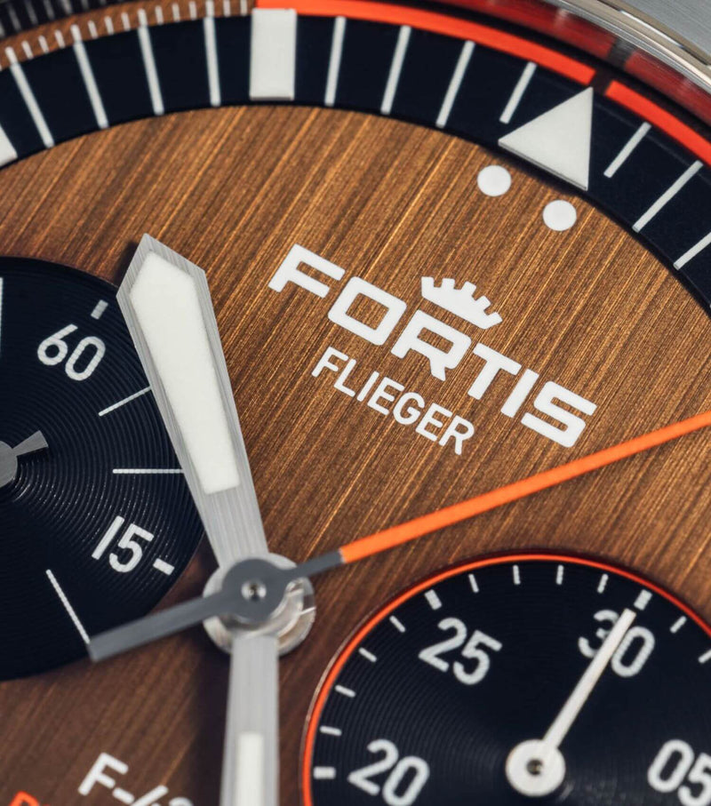 Vertically brushed Brown dial with applied circular brushed Brixtrack®. White Brix made of Superluminova®X1. Snchroline® in Berlac Fluor Orange.