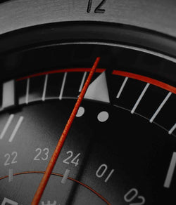 Vertically brushed black dial with applied circular brushed Brixtrack®. White Brix and GMT-Numerals made of Superluminova®X1. Synchroline® in Berlac Fluor Orange