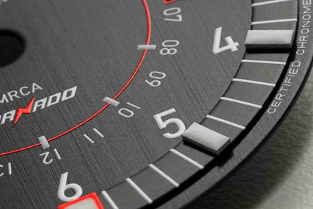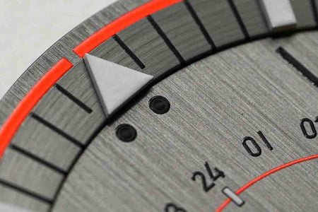 Vertically brushed black dial with applied circular brushed Brixtrack®. White Brix and GMT-Numerals made of Superluminova®X1. Synchroline® in Berlac Fluor Orange