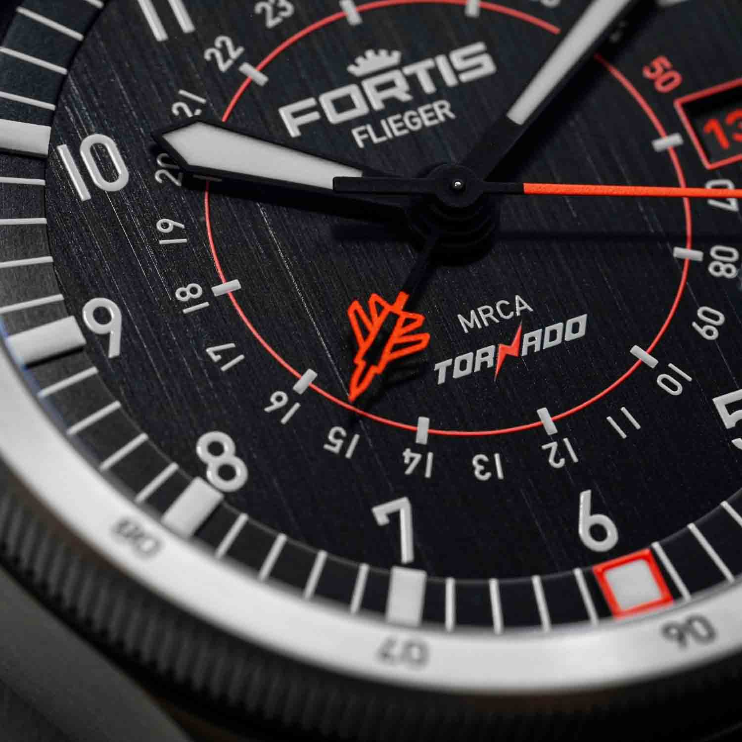 Vertically brushed black dial with applied circular brushed Brixtrack®. White Brix and GMT-Numerals made of Superluminova®X1. Synchroline® in Berlac Fluor Orange. Special Markings for the Limited Tornado Edition.