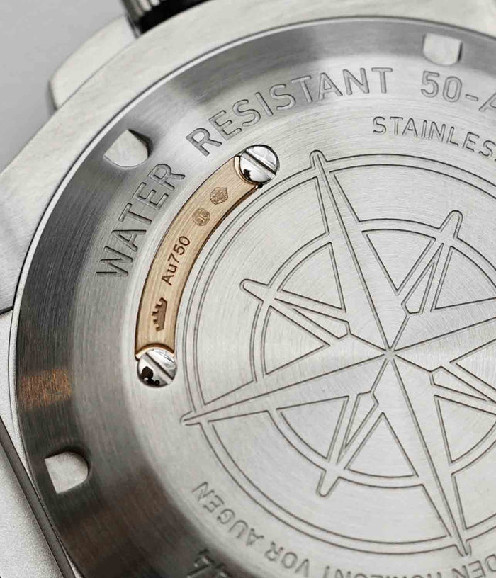 The caseback of the Marinemaster M-44 Black Resin Gold Limited Edition features ultra engraving, combined with a reminder of the rare gold that defines this limited edition. A symbol of strength and elegance, crafted for those who seek the extraordinary.