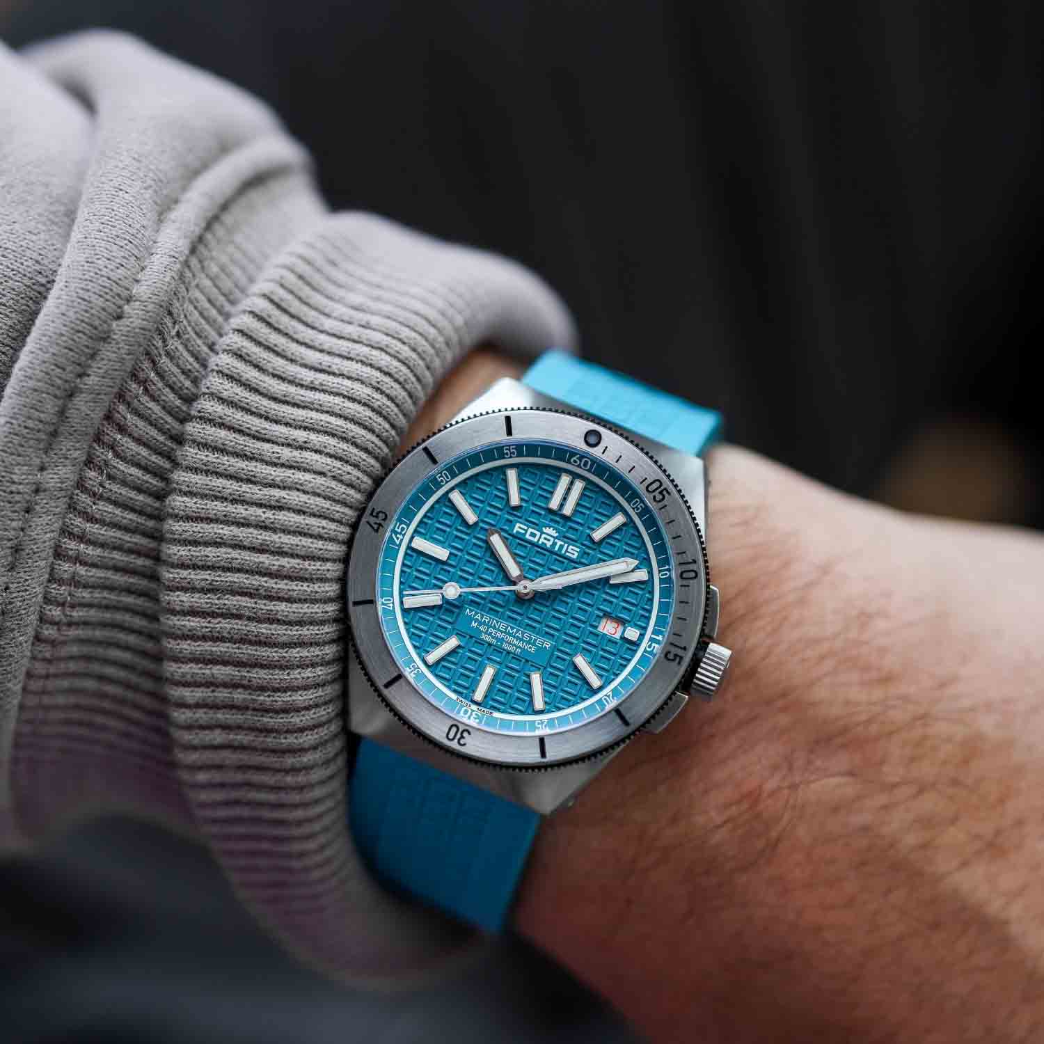 The dial features hand applied markers saturated in Superluminova® X1 and the pattern gently mirrors the Fortis “O”.