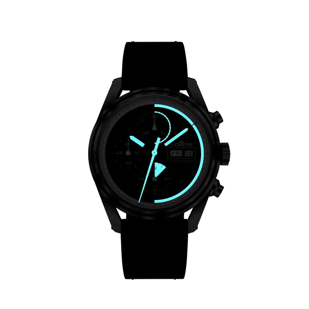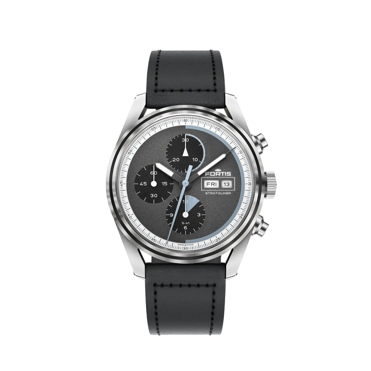 The Stratoliner Cosmic Gray, with its dark gray and black counters, evokes the mystery of space’s darkest corners. It’s daring, minimalist, and designed for those brave enough to be different.